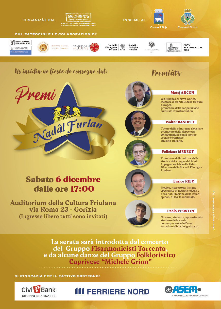 Il premio Nadâl Furlan, istituito nel 1979, ha la finalità di dare un pubblico riconoscimento a persone che si sono distinte nell’impegno umanitario, sociale, artistico e culturale, ispirato ai valori cristiani , a servizio della società e della comunità friulana in particolare.